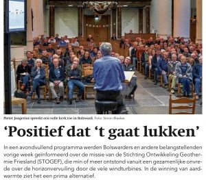 Uit een persbericht van onze gemeente in de maand december 2021 is duidelijk geworden dat onze gemeente SWF een bedrag van € 171.320,- beschikbaar heeft gesteld voor een haalbaarheidsonderzoek aardwarmte te Bolsward. Dit onderzoek wat gezamenlijk met de Stichting Ontwikkeling Geothermie Friesland (Stogef) en Energiewerkplaats Fryslân wordt uitgevoerd heeft als doel om te onderzoeken of er daadwerkelijk tot uitvoering kan worden overgegaan met aardwarmte om Bolsward te verwarmen.